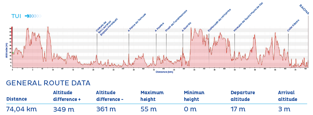 From the fishing village of A Guarda, the route follows a coastal cycle lane northward along a rugged shoreline, sharing parts of the path with the Portuguese Coastal Camino. It continues through Oia, known for its Cistercian monastery, before reaching the seaside town and tourist hub of Baiona.