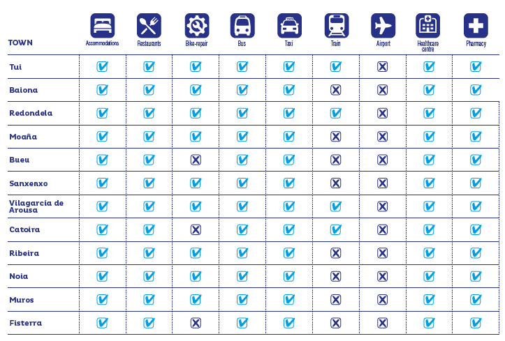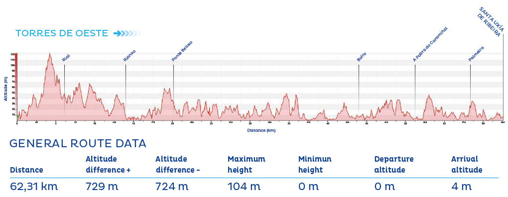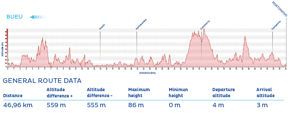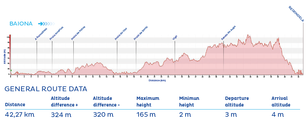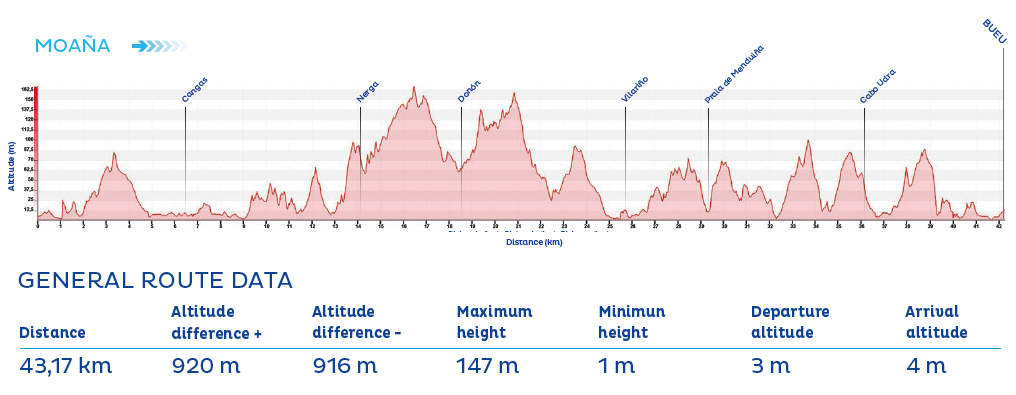 The final part of the stage follows the contour of the Ría de Aldán and passes numerous beaches such as Menduíña, Area de Bon, Lagos, and Ancoradouro before arriving in the coastal town of Bueu.