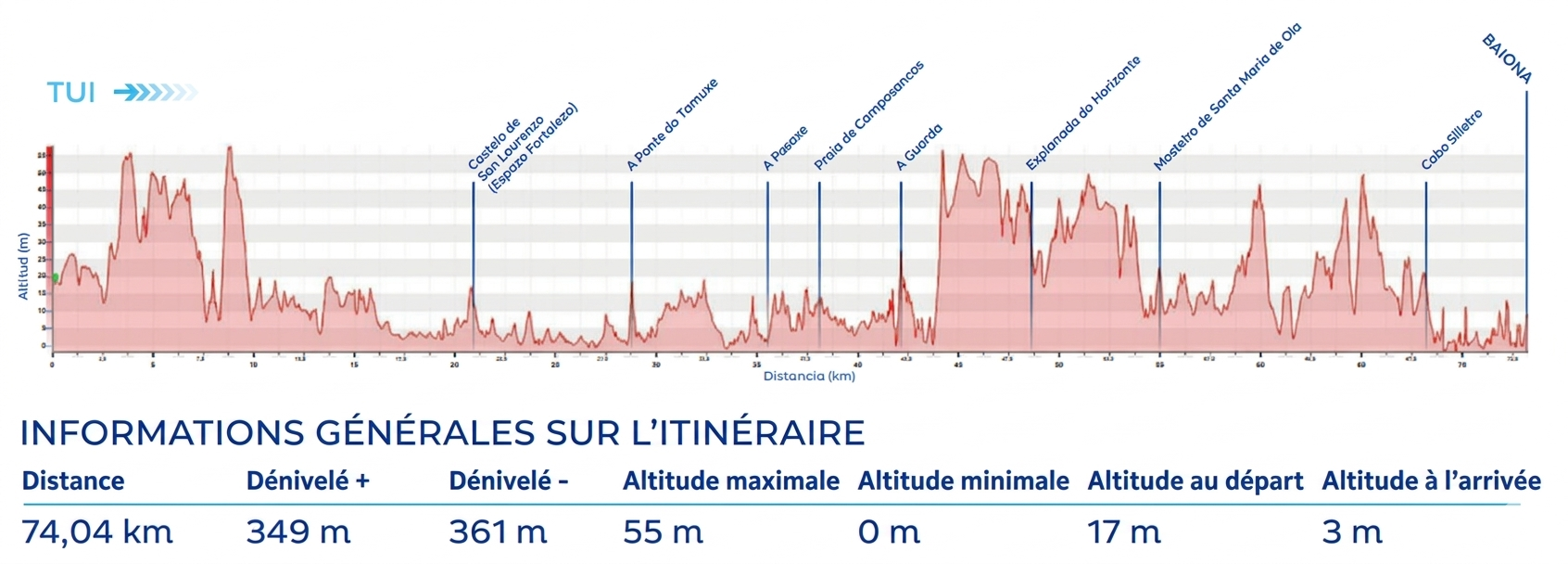 Depuis le village de pêcheurs d'A Guarda, l'itinéraire se poursuit vers le nord en empruntant une piste cyclable côtière qui longe un littoral escarpé et sauvage et qui partage plusieurs tronçons avec le Chemin portugais de Saint-Jacques-de-Compostelle par la Côte. Il passe par Oia, une ville côtière célèbre pour son monastère cistercien puis continue jusqu'au village de pêcheurs et de touristes de Baiona.
