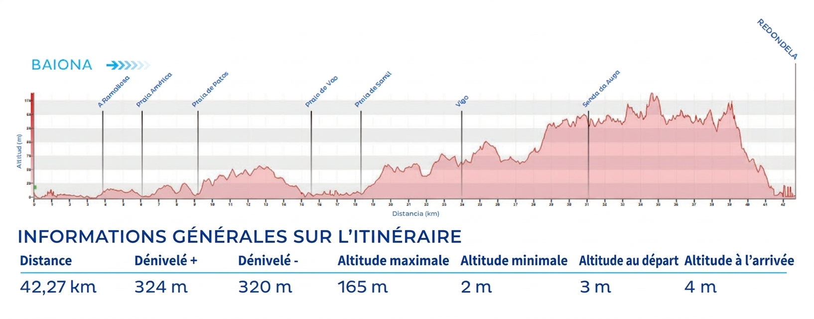 Au départ de Baiona, l'itinéraire se poursuit sur la piste cyclable en direction de l'estuaire de la Foz do Miñor, un endroit où l'on peut admirer la faune variée du marais. Après être passés près du pont médiéval de Ramallosa, l’itinéraire arrive à la longue plage touristique d'América, qui s'étend jusqu'au port de Panxón. Ici, le cyclotouriste poursuit sa route vers le nord jusqu’à apercevoir la crique de Samil, puis traverse la ville de Vigo en empruntant sa piste cyclable. Le parcours se poursuit sur le « Sentier de l’eau », d'où l'on peut admirer une vue panoramique spectaculaire sur l’estuaire de Vigo et le pont de Rande.