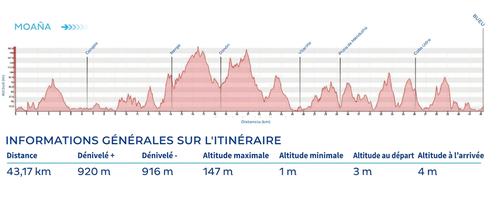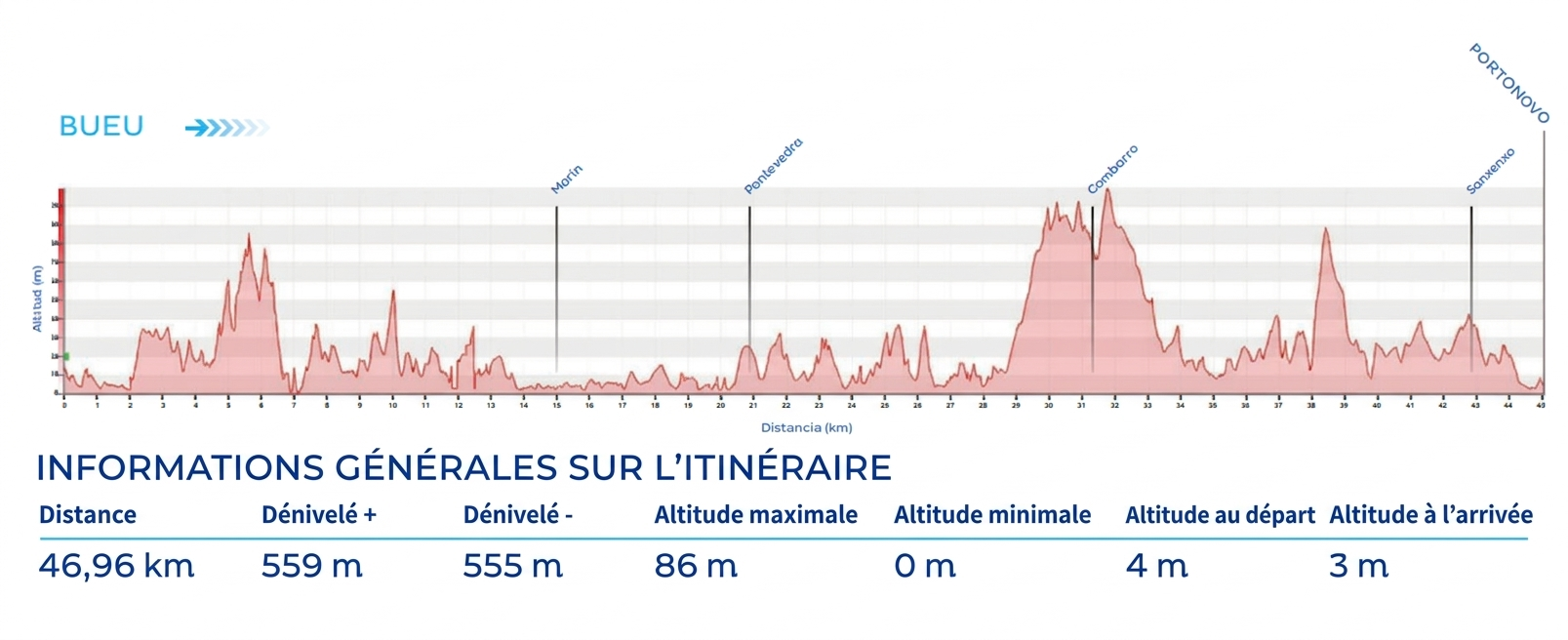 Au départ de Bueu, l'itinéraire contourne presque l'intégralité de l’estuaire de Pontevedra. Au cœur des Rías Baixas, les cyclotouristes pourront profiter d'un paysage côtier offrant de nombreuses plages propices à la baignade et de sentiers littoraux au charme indéniable.