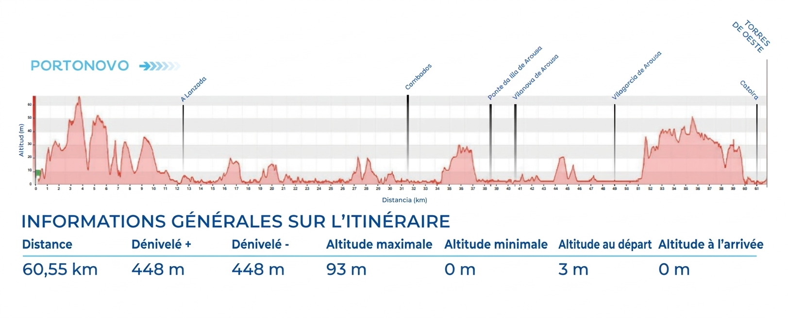 Il entre ensuite dans l’estuaire d’Arousa par la crique d’O Grove. À Cambados, l'itinéraire se poursuit en direction du pont menant à A Illa de Arousa. À cet endroit, on emprunte le sentier connu sous le nom d’« O Terrón », qui fait partie du réseau de sentiers de Vilanova de Arousa. Nous arrivons au centre-ville de Vilagarcía de Arousa par une piste cyclable.